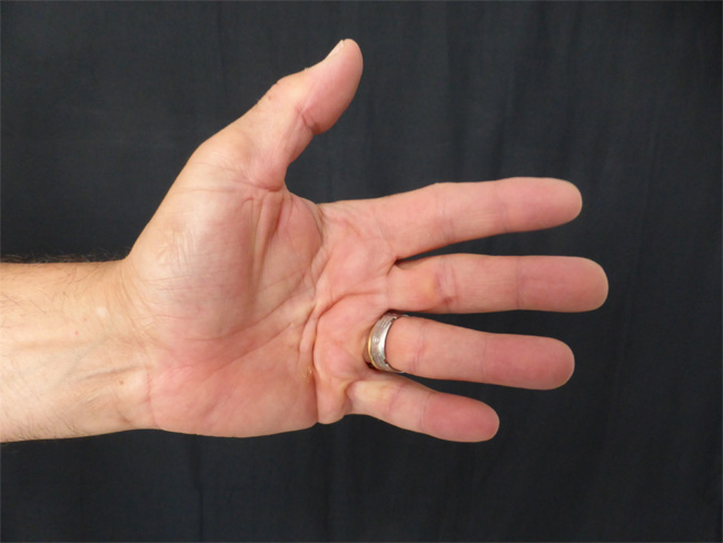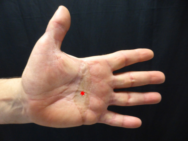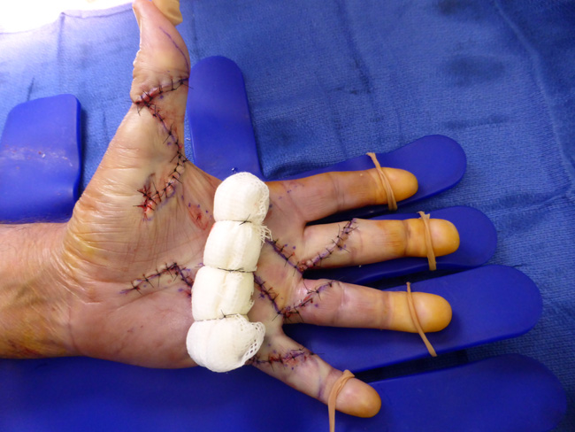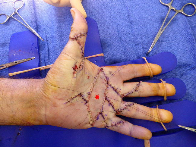 - L’extension est complète, tout est refermé, la greffe de peau * est au centre de la paume.