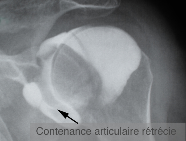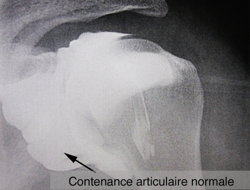 La contenance de l’articulation est très diminuée par rapport à la normale, à cause d’une rétraction de la capsule articulaire. C’est la définition de la capsulite.