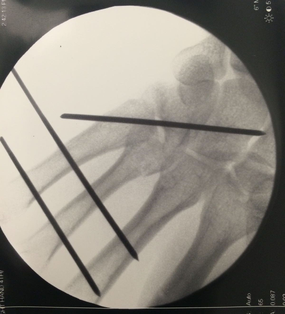 Cette radiographie au bloc opératoire a permis de vérifier la stabilisation par 3 broches qui seront enlevées après 6 semaines.