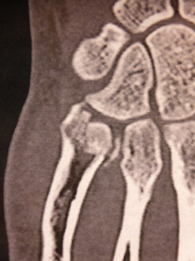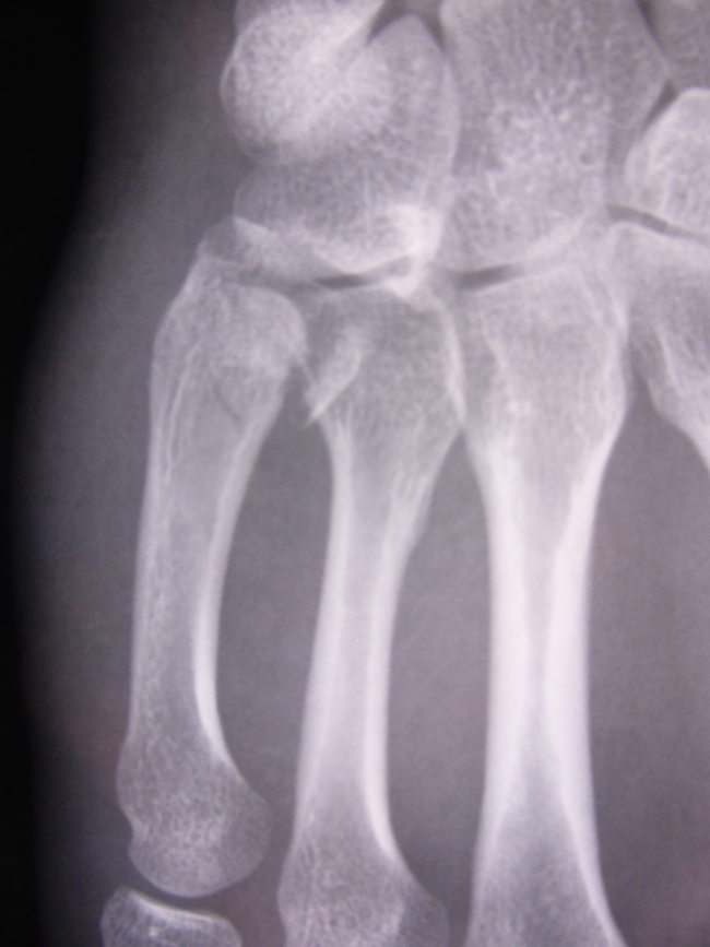 La fracture passe souvent inaperçue par l’examen de la main aux urgences et seule la radiographie et le scanner peuvent faire le diagnostic.