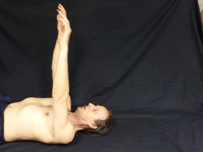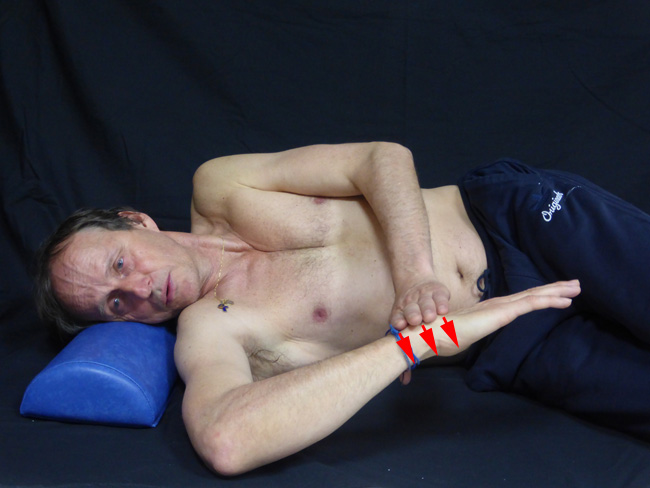 - Couché sur le côté l’autre main appuie sur le poignet vers le bas