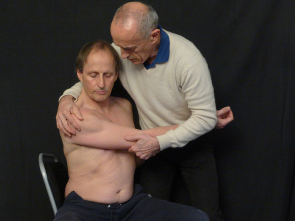 balancement pendulaire- Il s’agit de laisser balancer le bras d’avant en arrière, de droite à gauche puis en faisant des cercles en le laissant complètement décontracté, comme un bras de pantin